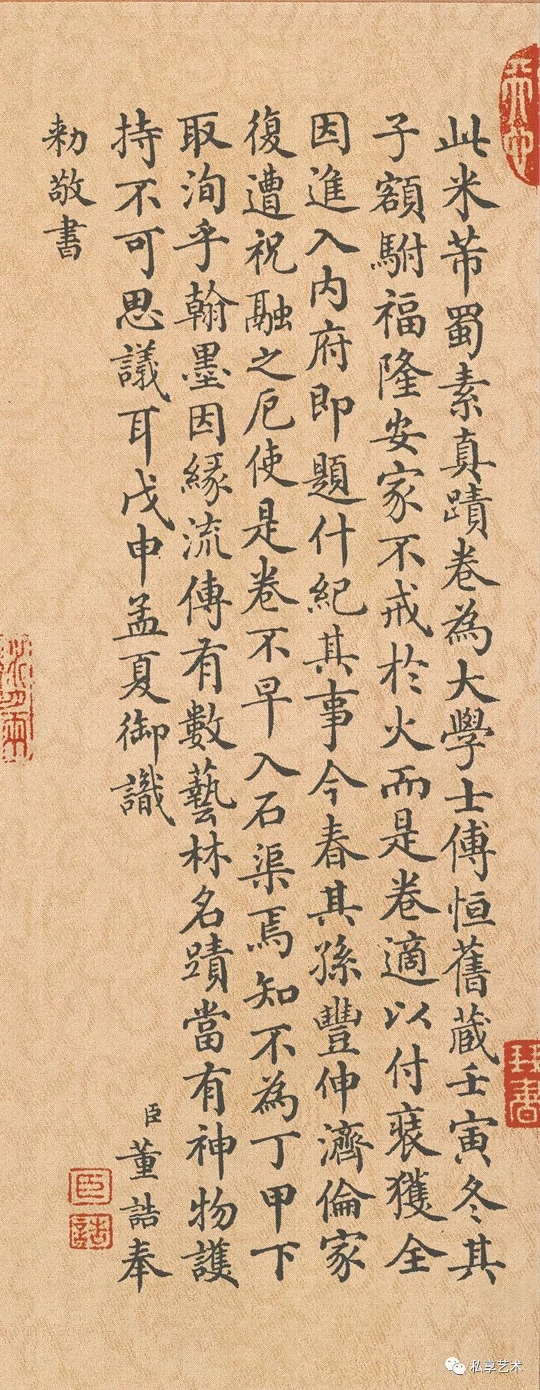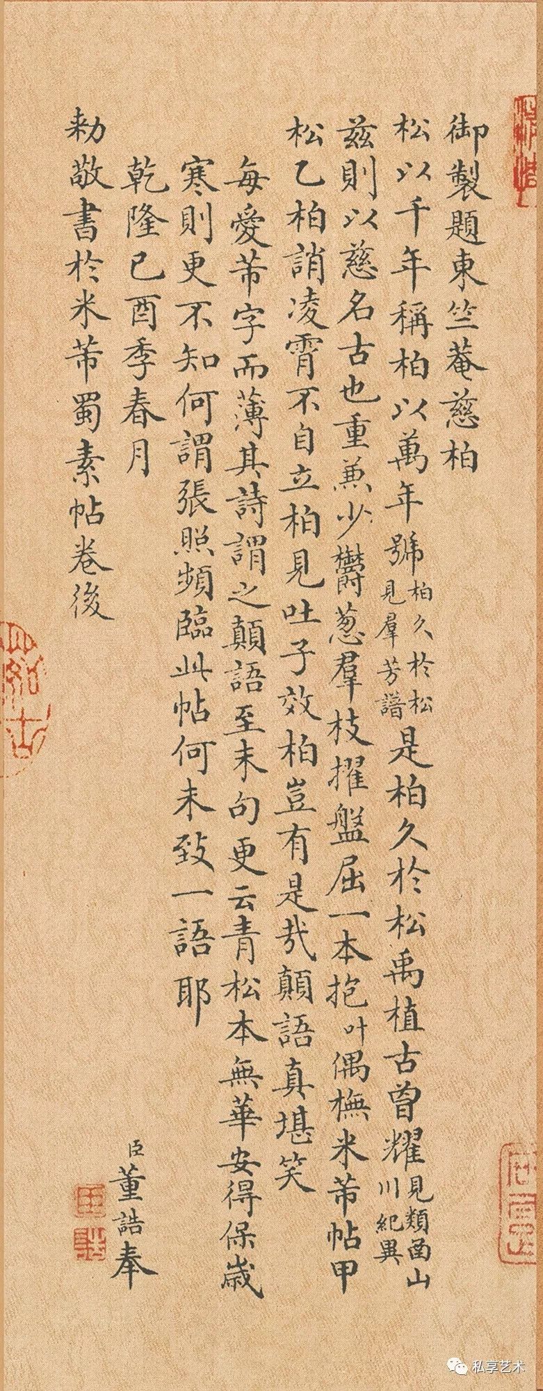 清代董诰楷书题跋:松以千年称,柏以万年号。是柏久于松,禹植古曽耀。兹则以慈名,古也重兼少。郁葱羣枝擢,盘屈一本抱。(叶)偶橅米芾帖,甲松乙柏诮。凌霄不自立,柏见吐子效。柏岂有是哉。颠语真堪笑。每爱芾字而薄其诗,谓之颠语,至末句更云:青松本无华,安得保岁寒。则更不知何谓。张照频临此帖,何未致一语耶?乾隆己酉(1789)季春月。 臣董诰奉。敕敬书于米芾蜀素帖卷后。