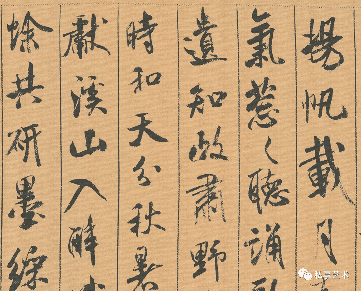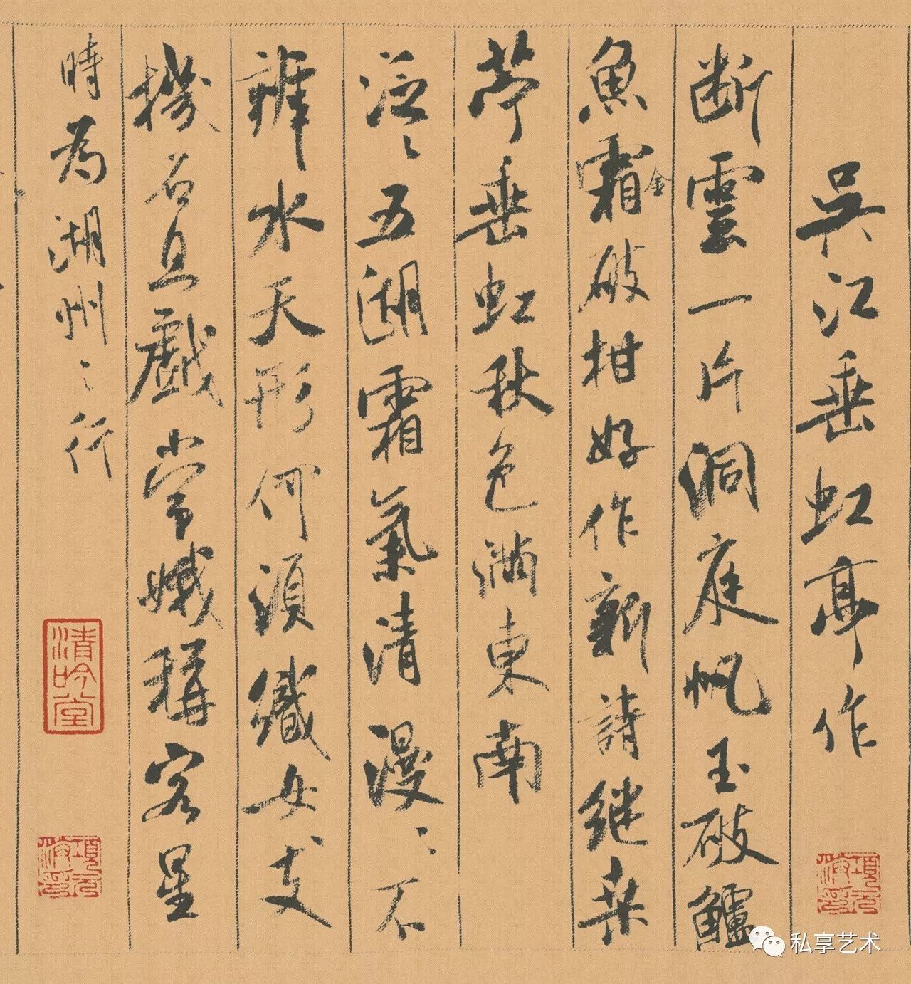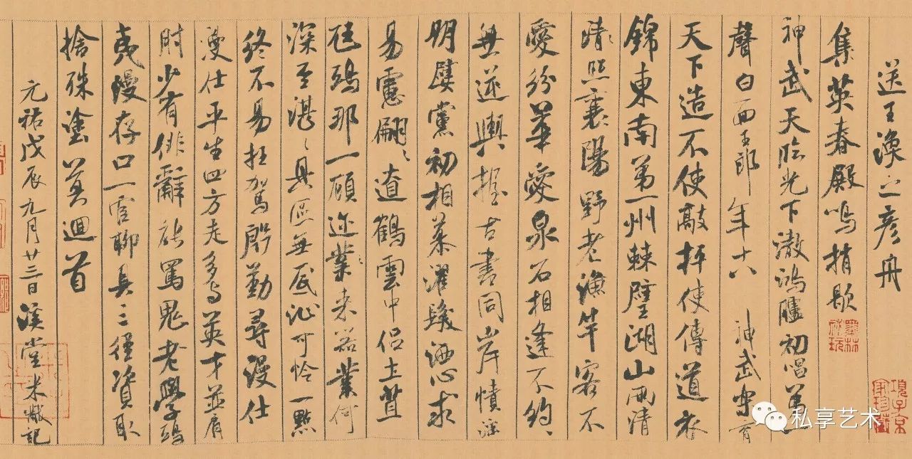 “蜀素”乃北宋时四川所造、质地精良的丝绸织物,上有鸟丝栏列,因纹罗较纸粗糙,滞涩难写,且不吃墨、不洇墨,非功力深厚之书家不敢挥毫於上,所以宋代湖北郡(今浙江吴兴)郡守林希收藏此卷蜀素数余年,直至元佑三年(1088)八月,米芾应林希之邀,结伴游览太湖近郊的苕溪,方在这卷蜀素上留下墨迹,即兴写下八首诗,卷末署“元佑戊辰,九月二十三日,溪堂米芾黻记”,并钤有“米姓之印”,时年三十八。