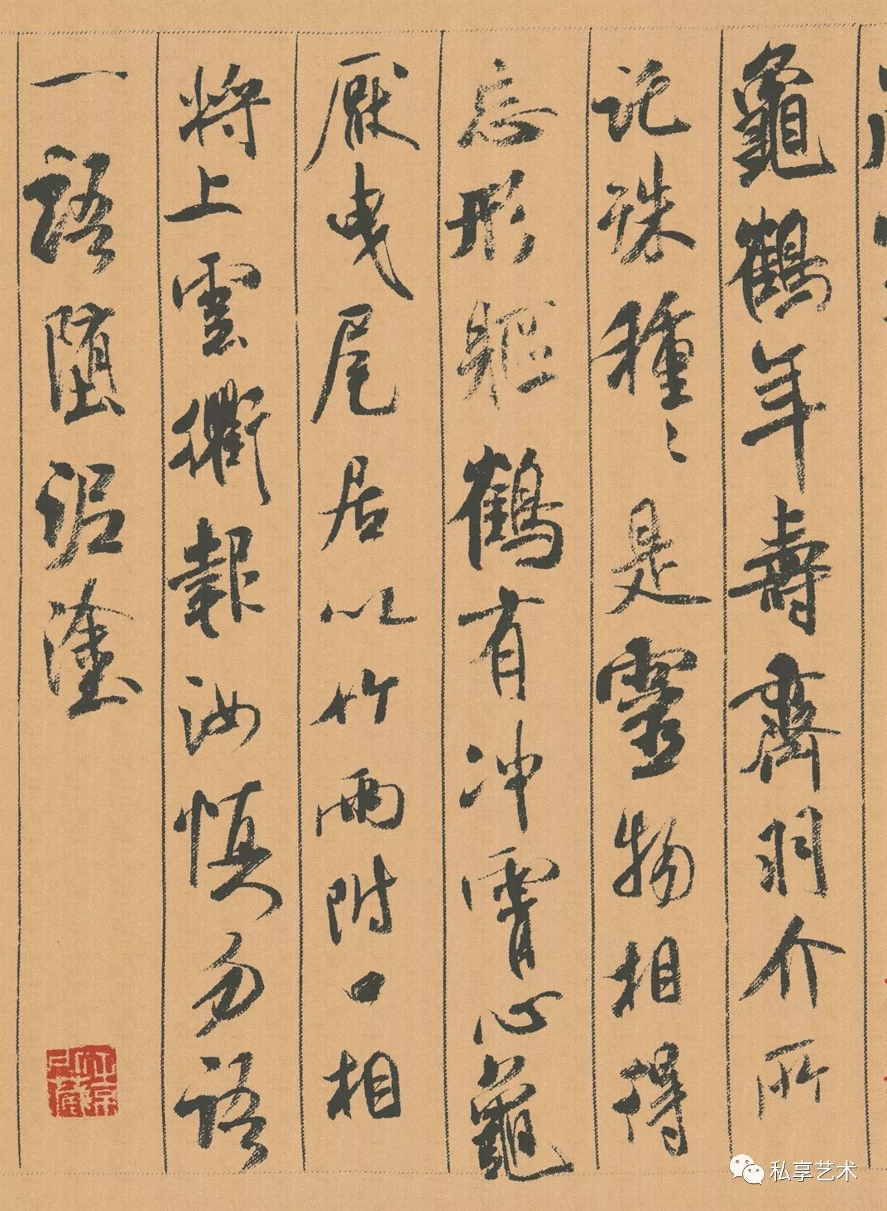 释文:青松劲挺姿。凌霄耻屈盤。种种出枝叶。牵连上松端。秋花起绛烟。旖旎云锦殷。不羞不自立。舒光射丸丸。柏见吐子效。鹤疑缩颈还。青松本无华。安得保岁寒。龟鹤年寿齐。羽介所托殊。种种是灵物。相得忘形躯。鹤有冲霄心。