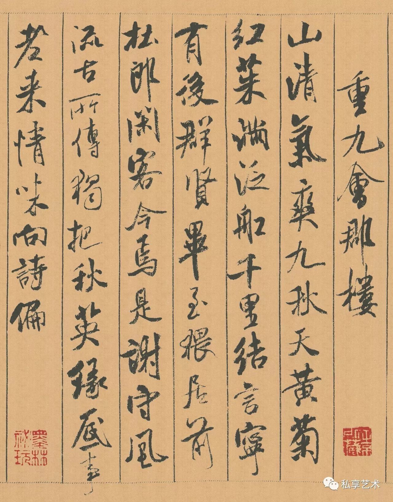 释文:山清气爽九秋天。黄菊红茱满泛船。千里结言宁有後。群贤毕至猥居前。杜郎闲客今焉是。谢守风流古所传。独把秋英缘底事。老来情味向诗偏。
