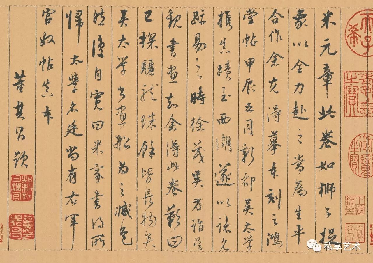 明代董其昌题跋:米元章此卷如狮子捉象,以全力赴之,当为生平合作。余先得摹本,刻之鸿堂帖,甲辰(1604)五月,新都吴太学携真迹至西湖,遂以诸名迹易之。时徐茂吴方诣吴观书画,知余得此卷,叹曰:已探骊龙珠,余皆长物矣。吴太学书画船为之减色,然复自宽曰:米家书得所归。太学名廷,尚有右军官奴帖真本。董其昌题。