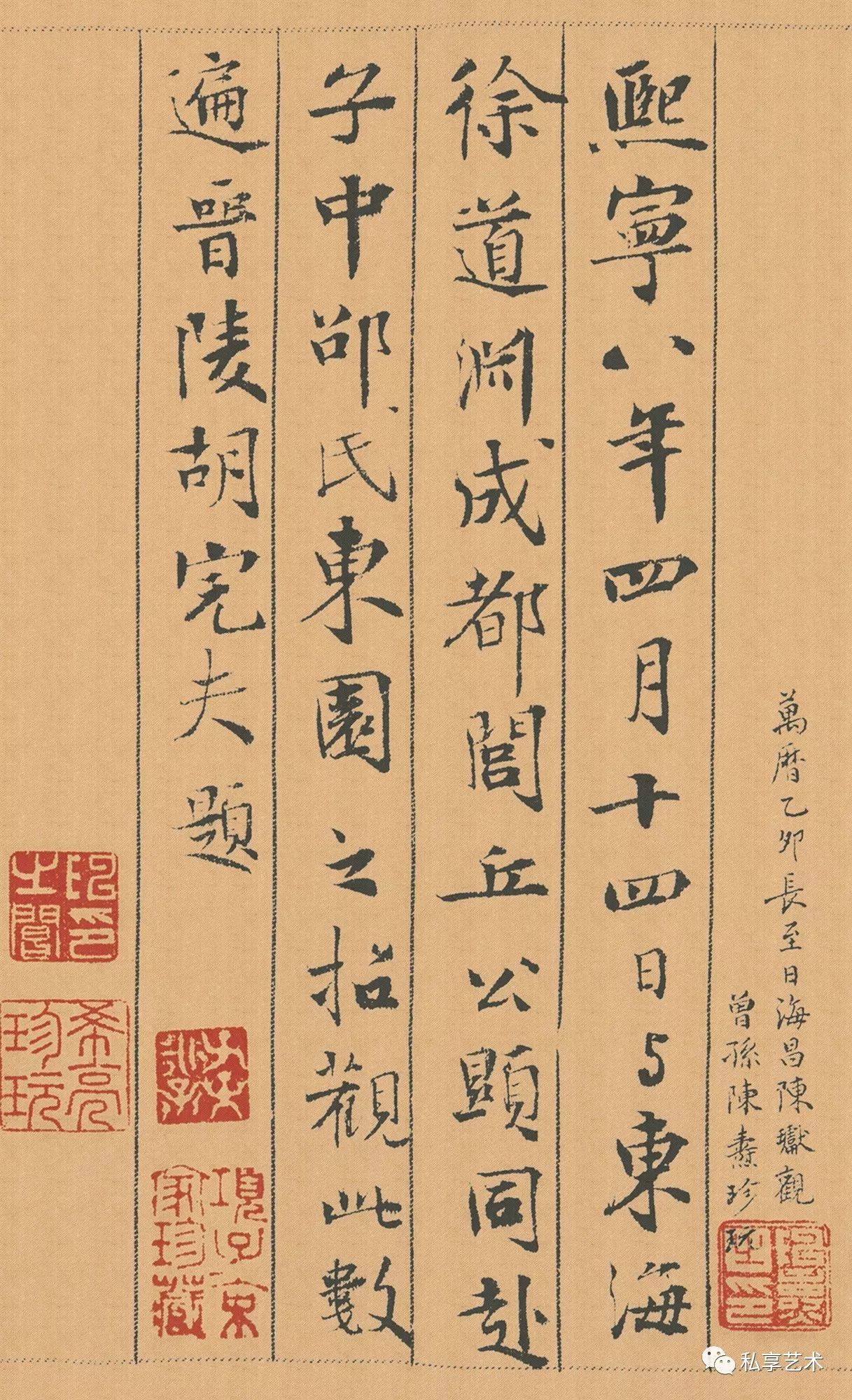 胡完夫行楷题跋:熙宁八年(1075年)四十四日,与东海徐道渊、成都闾丘公显,同赴子中邵氏东园之招,观此数遍,晋陵胡完夫题。