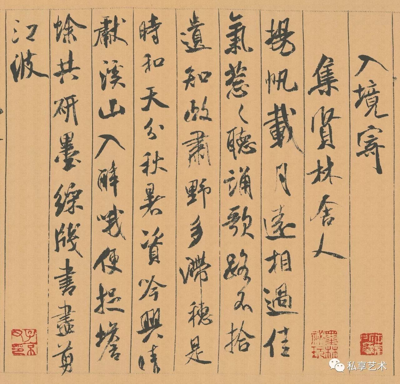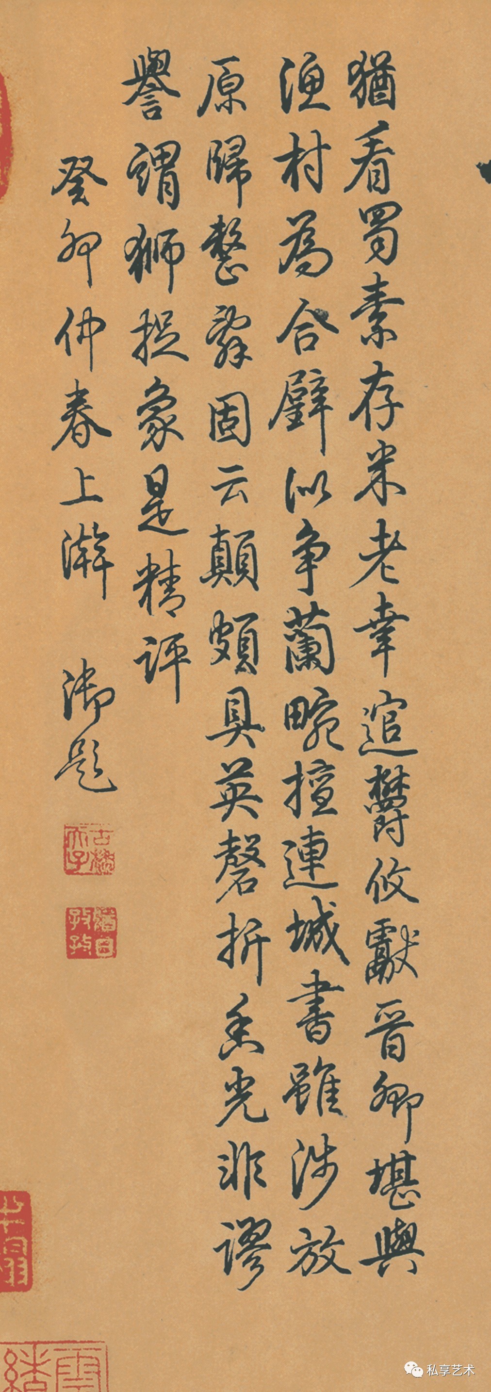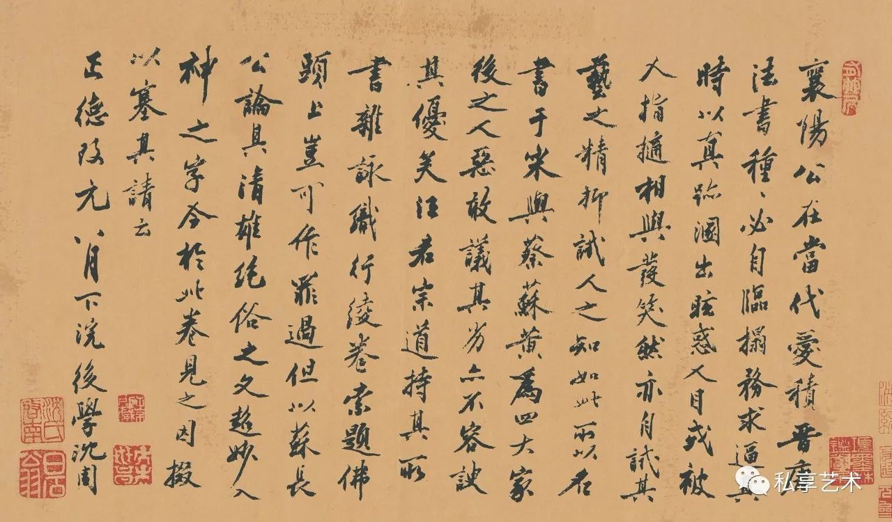 明代沈周行书题跋:襄阳公在当代,爱积晋唐法书,种种必自临搨,务求逼真。时以真迹溷出眩惑人目。或被人指擿,相与发笑。然亦自试其艺之精,抑试人之知。如此所以名书。于宋与蔡苏黄为四大家,后之人恶敢议其劣,亦不容谀其优矣。汪君宗道持其所书杂咏织行绫卷索题。佛头上岂可作罪过,但以苏长公论其清雄绝俗之文,超妙入神之字。今于此卷见之。因掇以塞其请云。正德改元(1506)八月下浣,后学沈周。