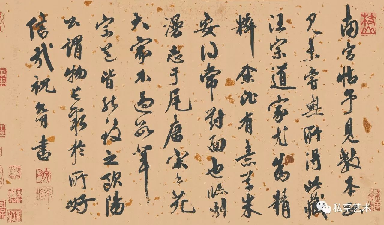 明代祝允明行草题跋:南宫帖予见数本,每见未尝无所得。此藏汪宗道家,尤为精粹。余比有意学米,安得常对面也,临别漫志于尾。唐宋书苑大家不过数辈,宗道皆能致之。欧阳公谓物长聚于所好,信哉!祝允明书。