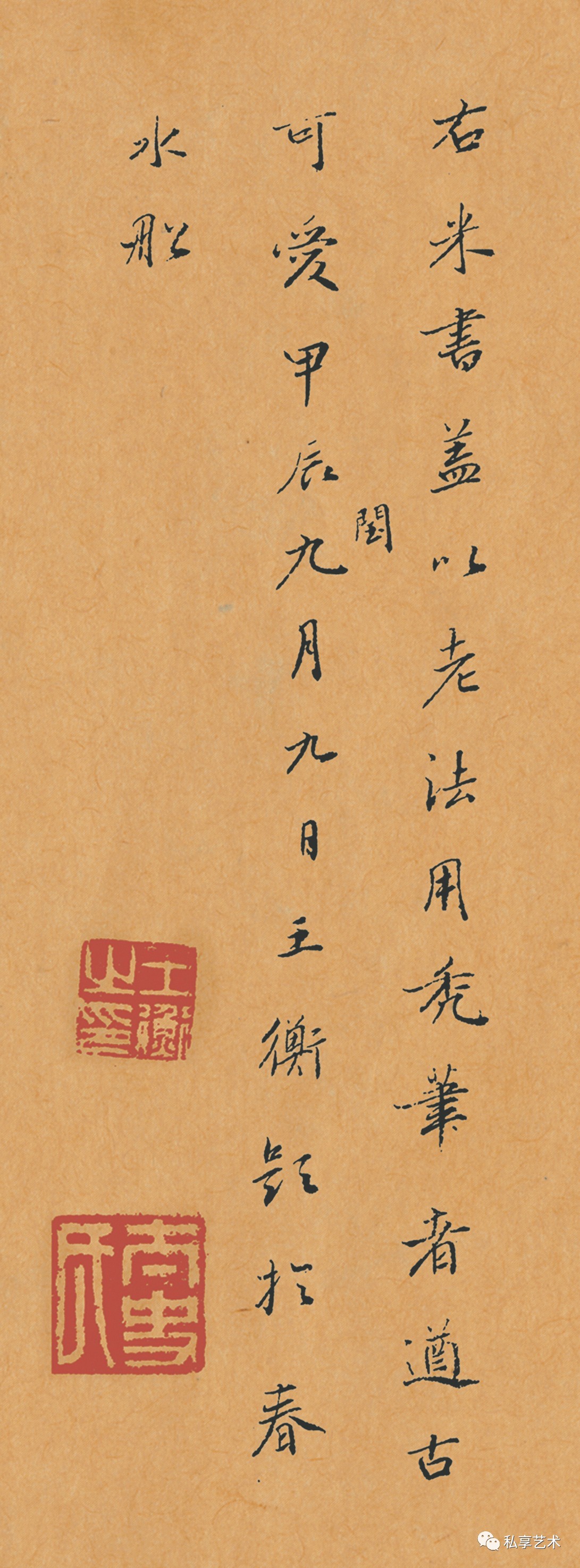 明代王衡行书题跋:右米书盖以老法用秃笔者,遒古可爱。甲辰(1604)闰九月九日王衡题于春水船。
