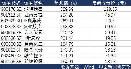 界面新闻统计发现,剔除2017年上市的新股外,2017年有698只个股股价上涨,而涨幅超过10%的有464只。这其中,鸿特精密(300176.SZ)、江南嘉捷(601313.SH)、亚翔集成(603929.SH)等40只个股涨幅超100%。