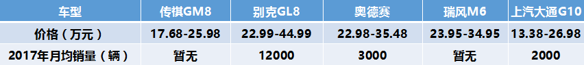 在此之前的中国市场,商务MPV基本被别克GL8占据。2017年,GL8的月销量稳定在12000辆。看样子GM8是决心要与合资车型GL8以及奥德赛等分一杯羹了。