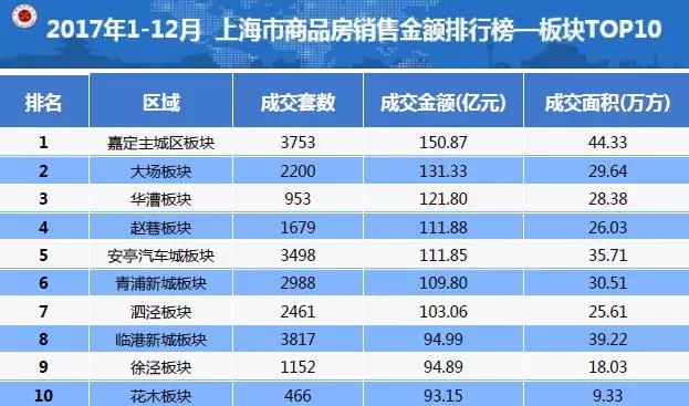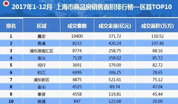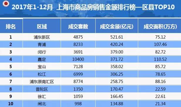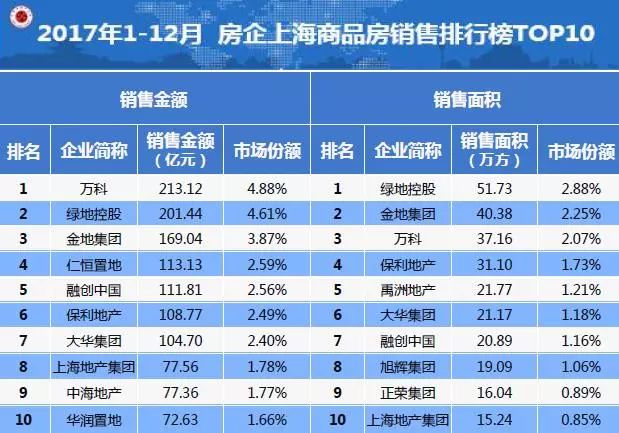 (1)2017年,上海商品房销售额TOP10门槛值超过70亿元,累计销售金额1249.57亿元,占上海地区全年商品房销售总额的28.61%。从榜单来看,TOP10房企各层级分化加剧,万科以全年213.12亿问鼎销售金额冠军。绿地控股和金地集团凭借其深耕上海市场多年的经验,注重品质打造,分别摘得第二、三名。对比上月房企上海销售排行榜,上海地产集团为新上榜企业,融创中国增幅较大,仁恒置地、保利地产、大华集团、中海地产、华润置地也取得了不错的成绩,在上海市场中占据一定的市场份额。