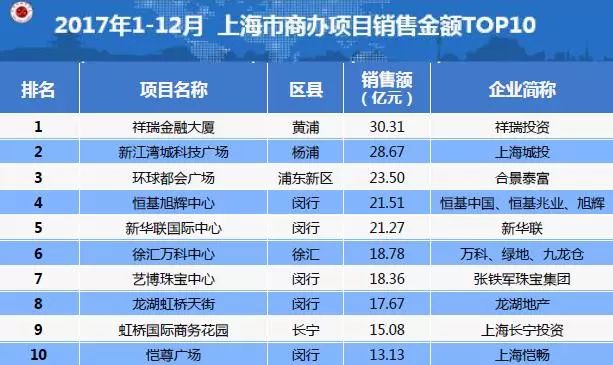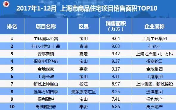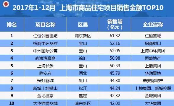 2017年1-12月房企上海销售排行榜以主营业务在内地的房地产开发企业为研究对象,以商品房为统计口径,主要以CREIS中指数据在上海的销售监测数据为准(销售数据涉及到权益分配的,为权益前数据),对于少数没有在监测范围内的项目,由企业提供相关证明文件,通过对数据进行严格审核,也纳入统计范围,本排行榜仅供参考。