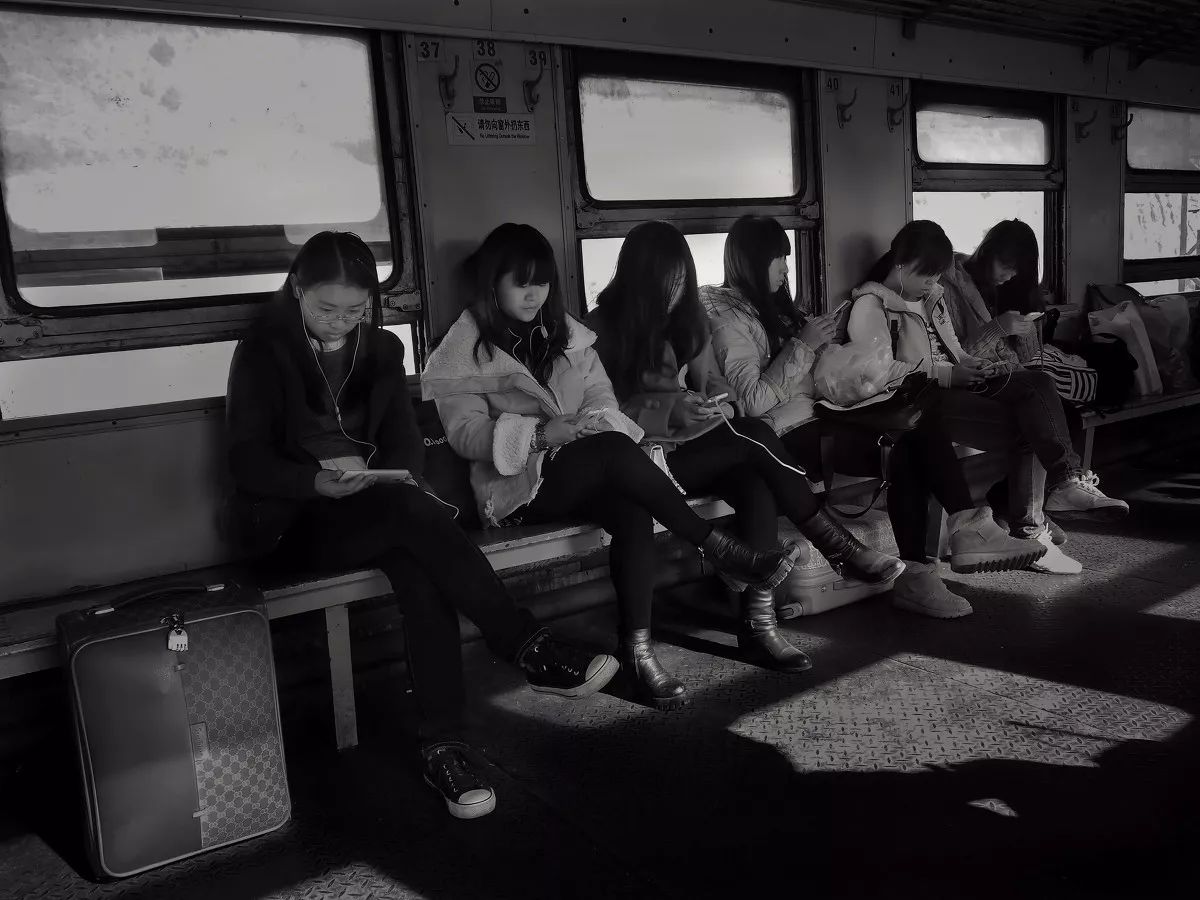 一群女大学生正利用乘坐列车无聊之际用手机打发时间。