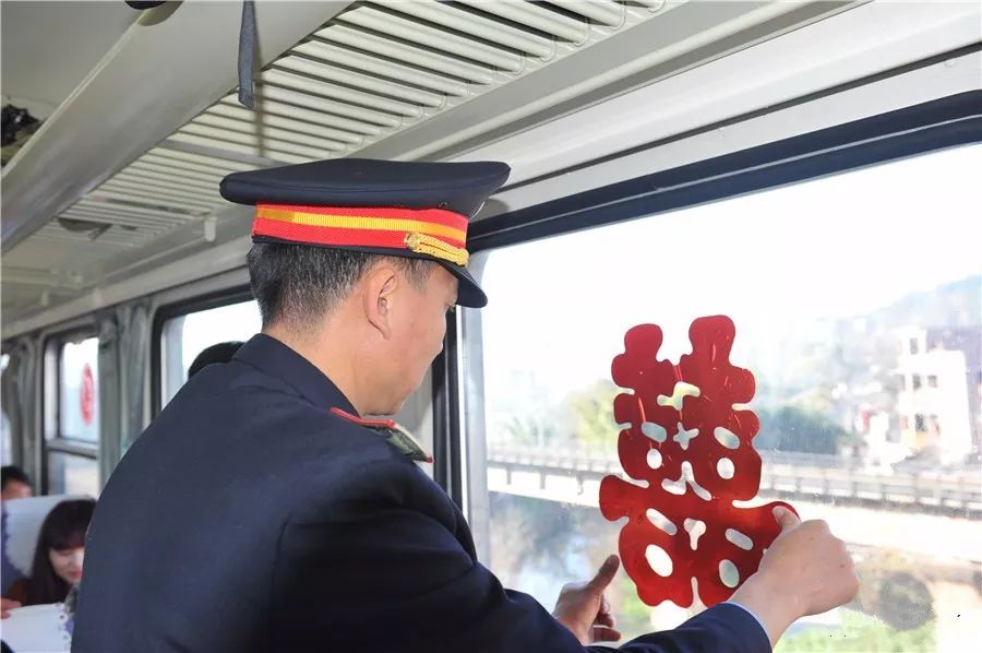 6162次旅客列车人员得知消息后提早为彝族新娘布置“婚车”,张贴“喜”字。