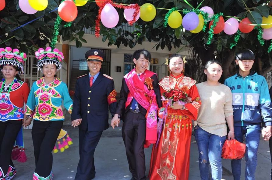 彝族新郎李春财和新娘卢薇接受车站站长杨学佳送上的表达祝福的大枣、桂圆和花生。