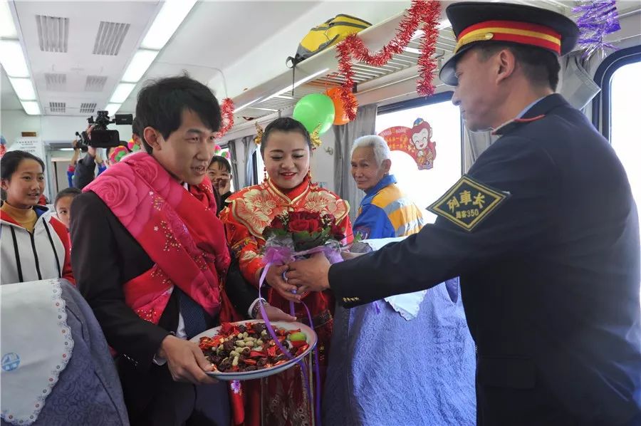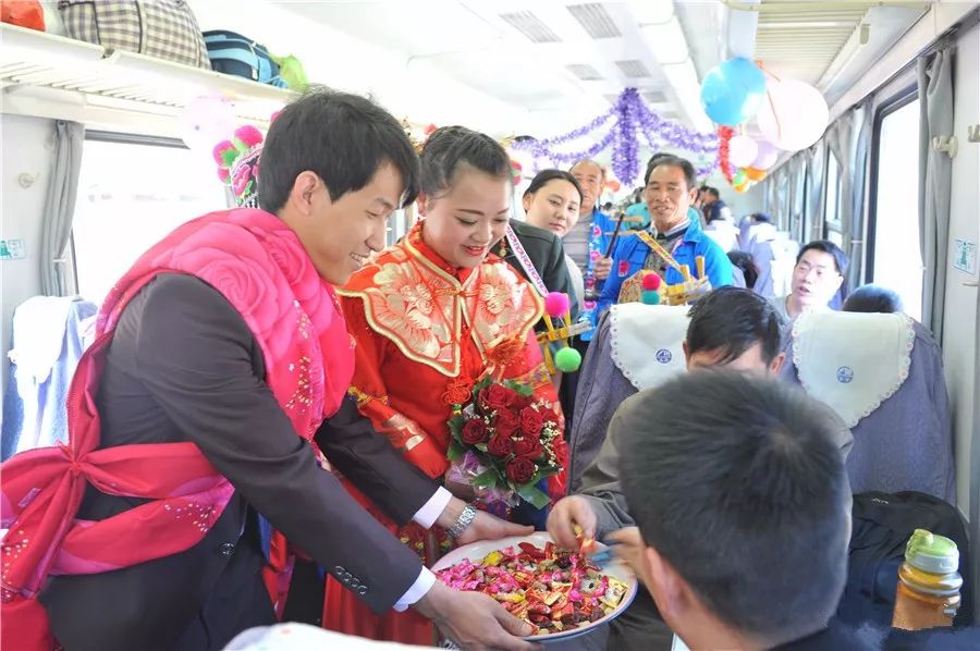 新人忙着给车厢里的旅客发喜糖,共同分享他们新婚的喜悦。