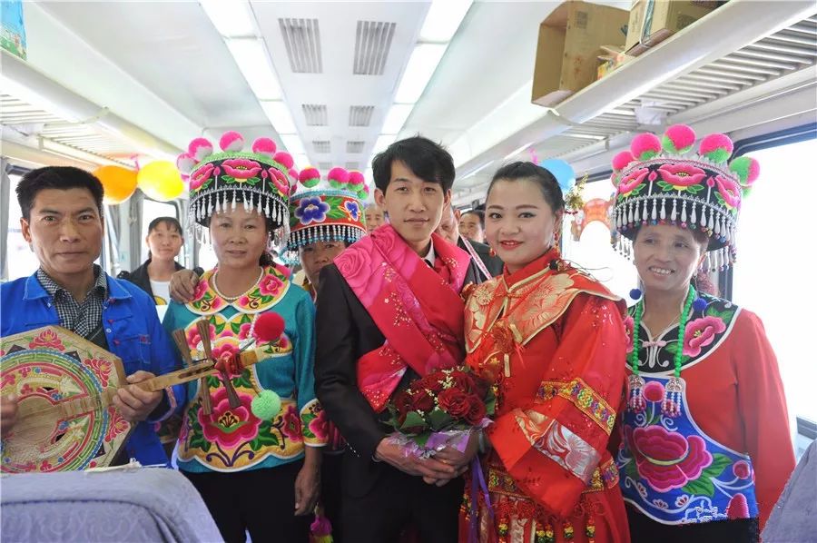 彝族新郎李春财把6162次列车当成“婚车”迎娶新娘,并在车厢里合影留念。