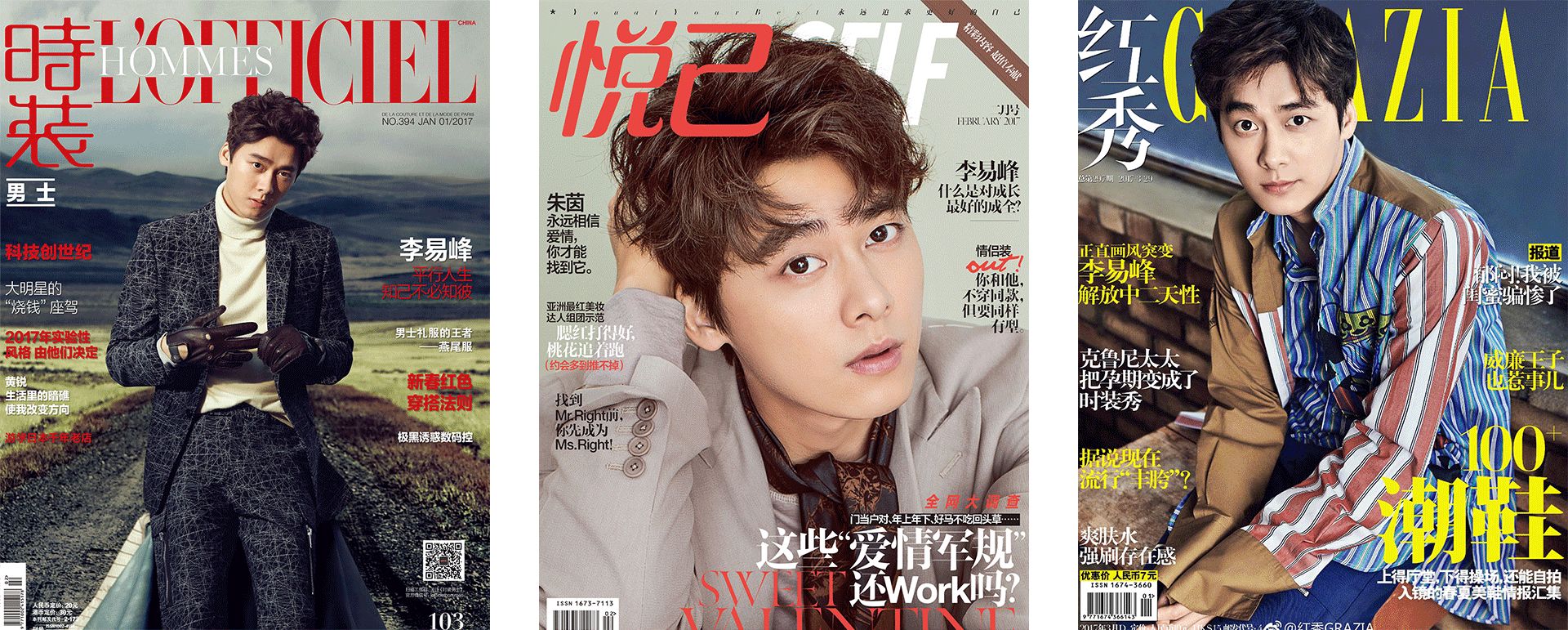 去年李易峰也收获了至少9个时装杂志封面。主要都是靠美颜在撑。