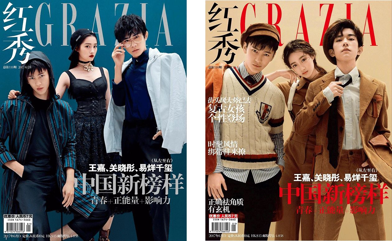 这组给《红秀》拍的三人合照,虽然磨皮严重到几近失真,但易烊千玺在三人里算抢眼的那个。