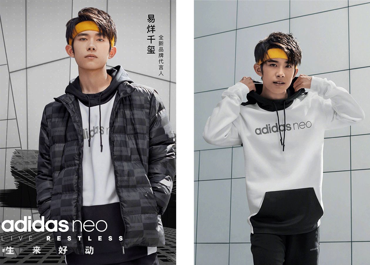 易烊千玺去年拿下了adidas neo代言人的身份,加入迪丽热巴、郑恺和郭采洁的大家庭。
