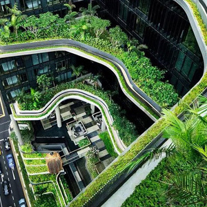 由 WOHA 建筑师事务所主持设计的 Parkroyal on Pickering 酒店是新加坡第一家“花园酒店”(367 间客房),坐落于市中心,已成为一座创新性的标志性建筑。瀑布般的绿植覆盖着整栋建筑,成为最引人注目之处。酒店设有诸多“花园”,面积达 1.5万平方米,种植着各类树木、花草、多叶灌木和攀缘植物等。作为节能的典范,酒店远远望去像是安放在一个 5 层的托盘上,托盘外观呈波浪形,使人不禁联想到层层叠叠的梯田。酒店的塔楼像是一颗海蓝色的马赛克宝石,其设计灵感来源于附近的新加坡河。景观设计分布在建筑的各个角落,一条铺设着绿植的户外天桥,如果要去客房的话则必须经过它。(撰文 v.c.)