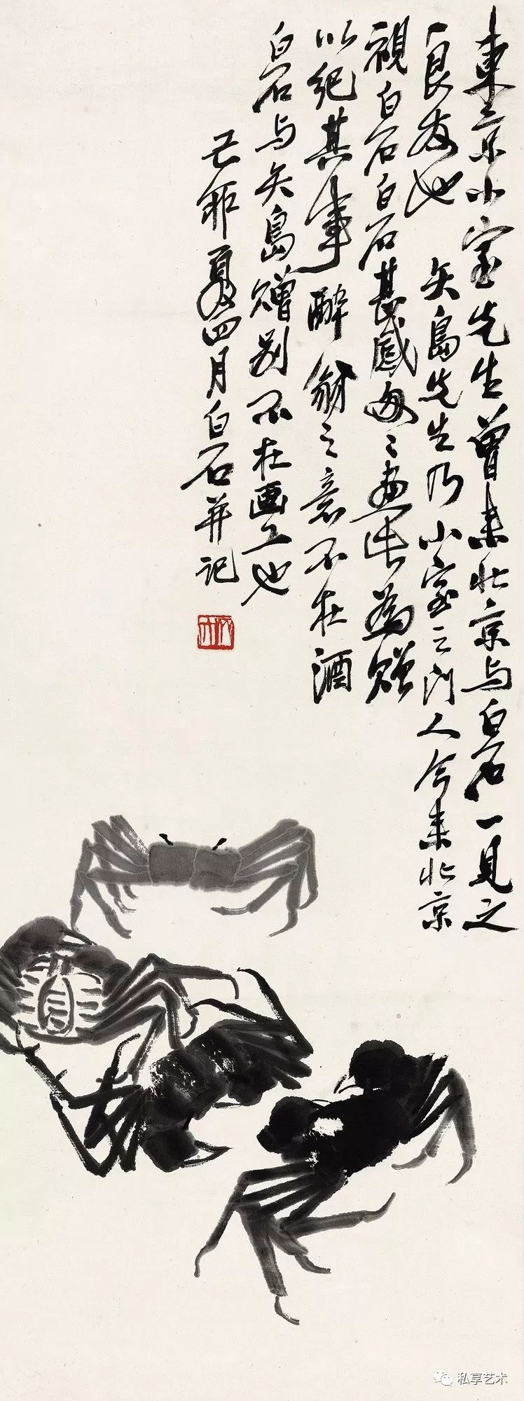 题识:东京小室先生曾来北京,与白石一见之良友也。矢岛先生乃小室之门人,今来北京视白石。白石甚感,匆匆画此为赠,以纪其事。醉翁之意不在酒,白石与矢岛赠别,不在画工也。己卯夏四月,白石并记。