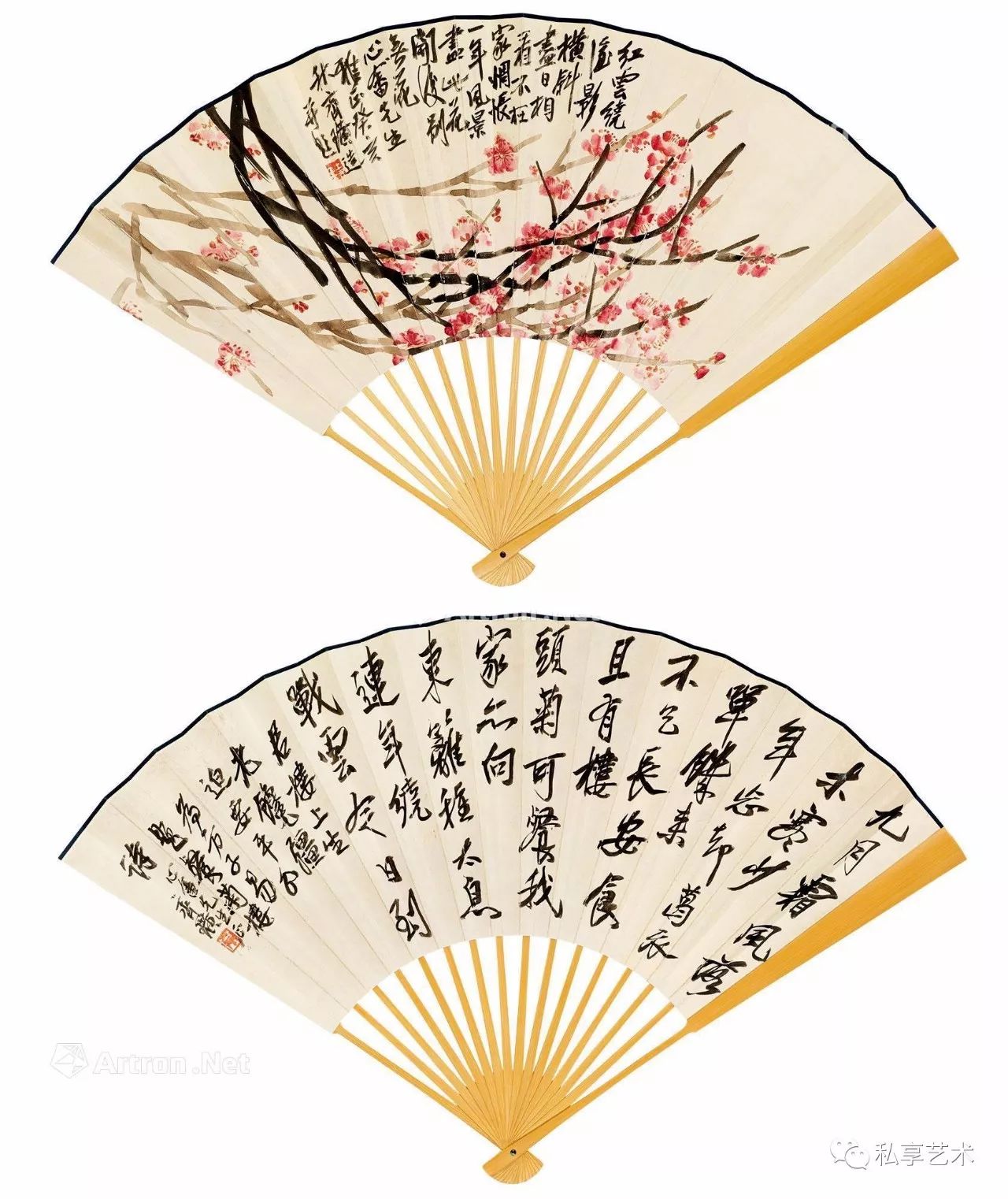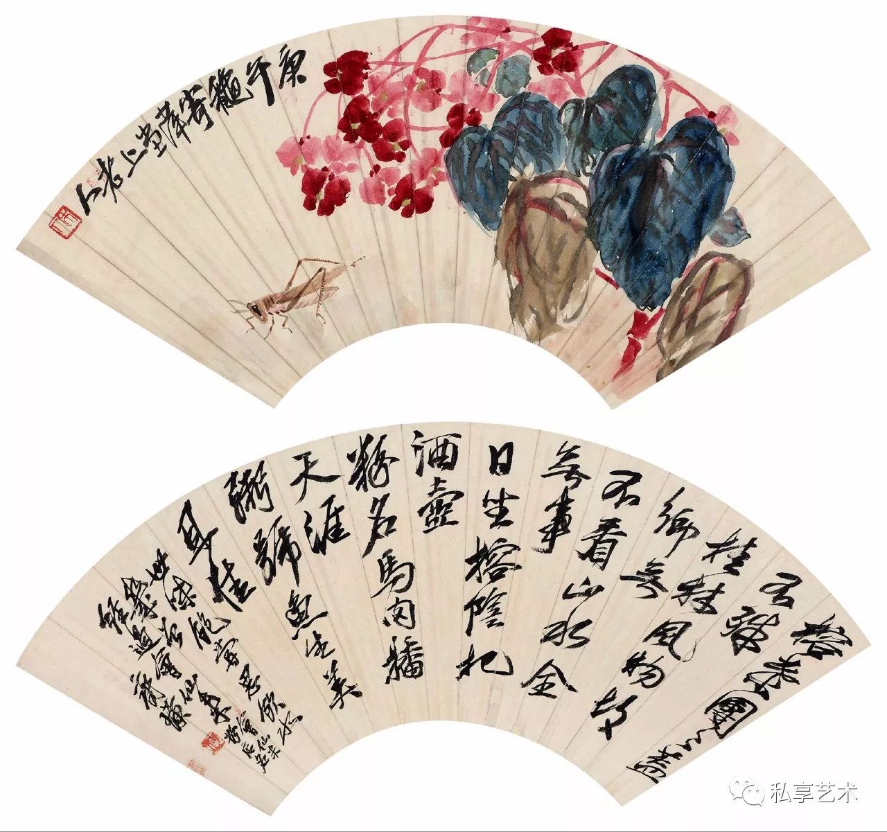 扇面题识:榕叶团团盖不殊,桂林风物故乡无。不看山水全无事,日坐榕荫把酒壶。粉名马肉播天涯,粥号鱼生美且佳。世味饱尝思饮水,几曾经过会仙来。粉店名,齐璜。印文:阿芝