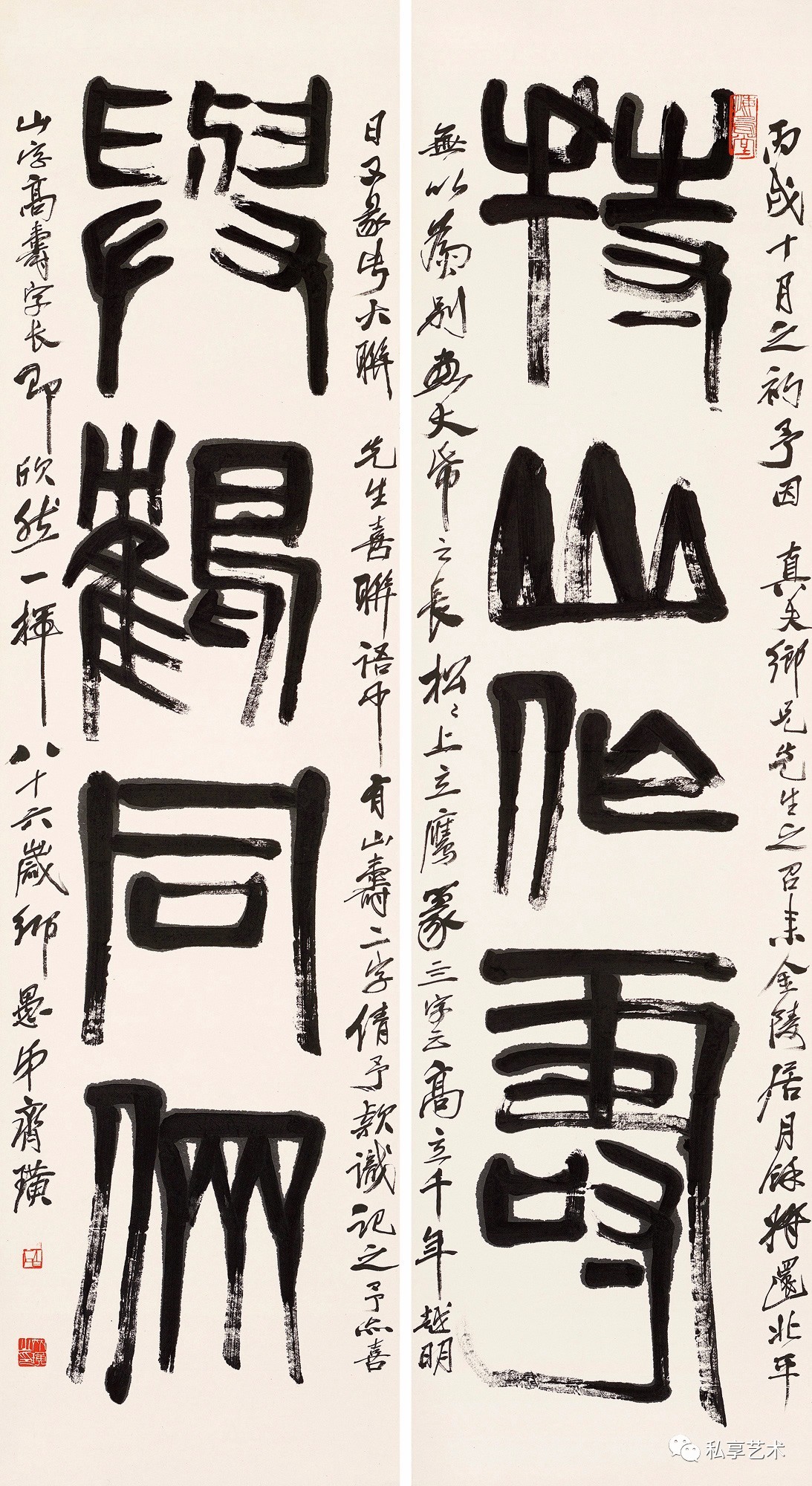 有时出现笔误或漏字,他一定会在文末注明,绝不敷衍欺世。82岁时书王安石诗,误将“川”字写错,特在题记中说明:“‘水’字篆成‘川’字,殊堪一笑。”