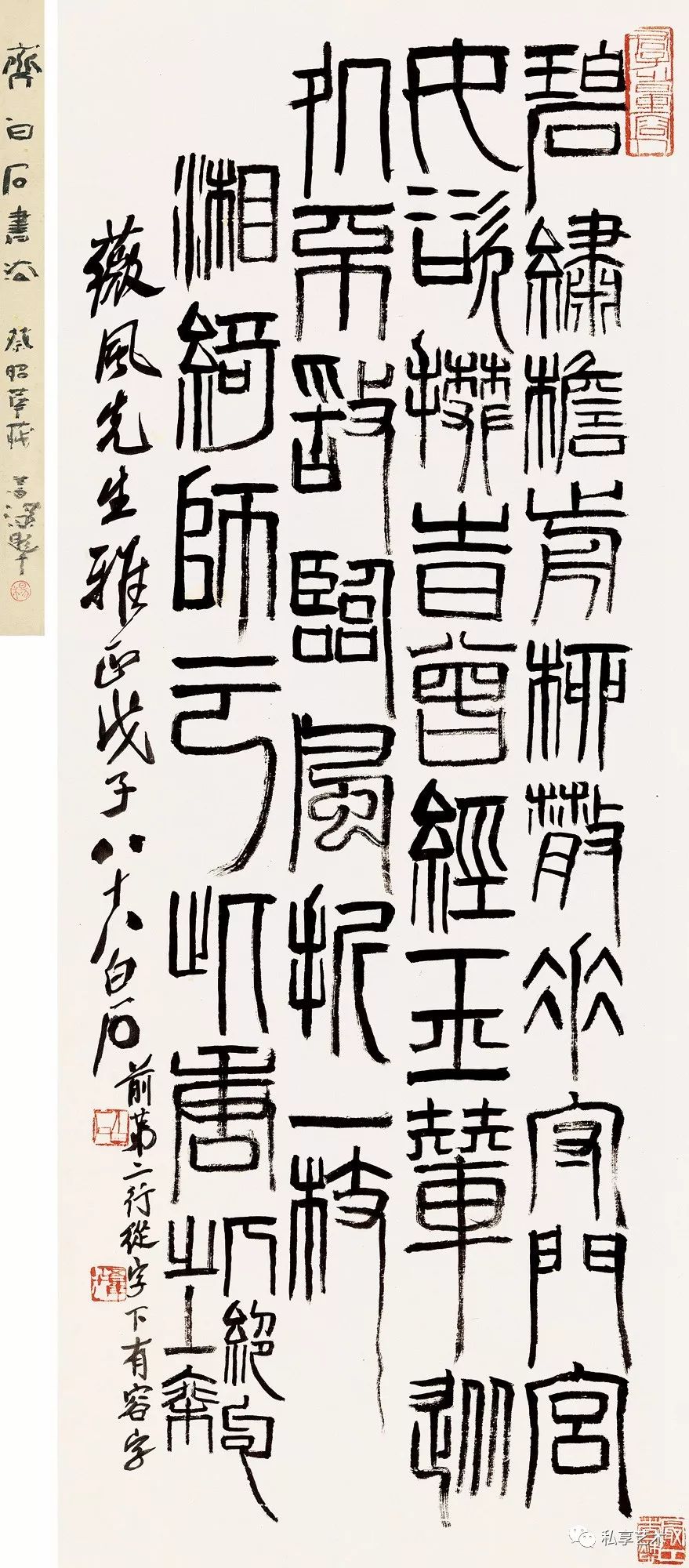 他的篆书主要取法于印章和东汉、魏晋南北朝之际兼有篆隶结体与韵味的碑版。齐白石中年时曾认真用朱笔勾临赵之谦的《二金蝶堂印谱》,为了学习治印,也是由此入门识别篆字。他的篆书多用于以擘窠大字写楹联、中堂、横披。他的篆书字体不是规范的小篆,也未上溯到金文甲骨,而是在篆隶相间中抒发豪迈、放逸、自由创造的精神意趣。