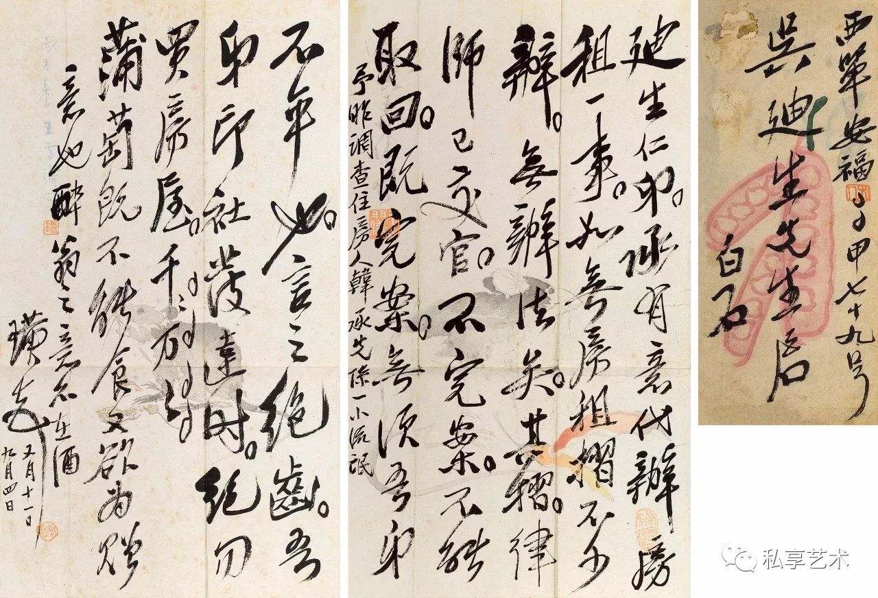 齐白石书法艺术的成就主要在行书和篆书两个方面。行草多用于画跋或书名、题识等,舒展大气,与画中形象相映成辉。而自由书写的日记、便笺等最见性情。