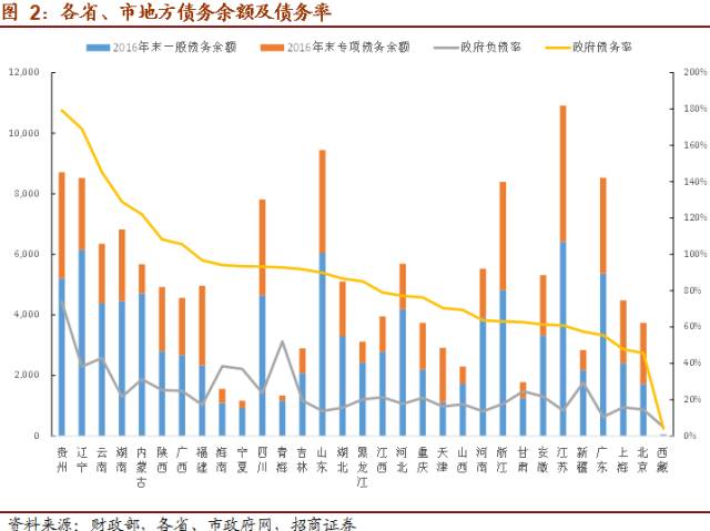 负债率和债务率是国际上常用的两个衡量政府债务的指标,其中负债率是指年末债务余额与当年GDP的比率,债务率是指年末债务余额与当年政府综合财力的比率。国际公认负债率60%、债务率90%-150%为安全警戒线。在31个省、直辖市中(不含港澳台),在考虑中央转移支付与税收返还后,仍有贵州、辽宁、云南、湖南、内蒙古、陕西、广西的债务率超过100%,福建、海南、宁夏、四川、青海、吉林的债务率超过90%,这些省份面临较大的政府债务压力。