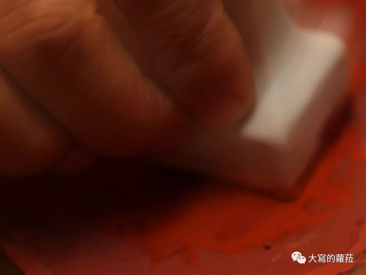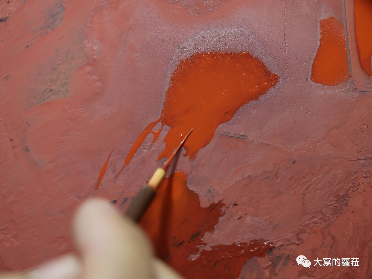 △福岛先生会从一整块红色彩石细细研磨成粉,加入中介物后制成赤彩漆料。