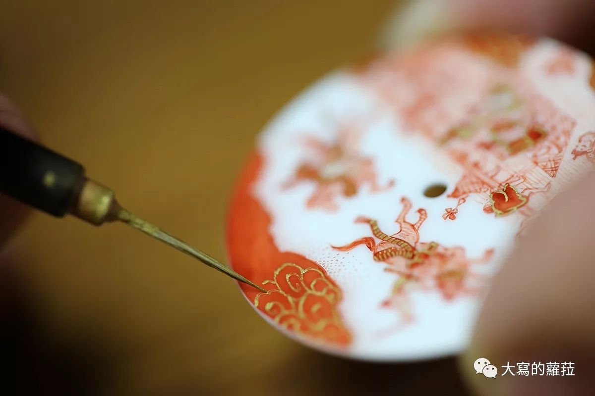 没有师学任何大师,只能从古书以及有限的照片资源,找出赤绘的技法。这个应该是源自中国明朝的瓷绘技巧,江户时期传至日本京都,再传至日本其他地区,成为我们现在所见的日本赤绘工艺。福岛先生为爱马仕创作的赤绘工艺,是在瓷胚上绘制京都贺茂神社庆典的12个图案,其中我们看到的金漆沟边,其实是福岛先生使用金箔细磨,并且要经过一天一夜的工序,才能准备制作为绘制用的金漆,福岛先生坚持使用这种古法制作金漆,主要是因为其细致且饱和的质地,他甚至谦称,比起200年前古人准备金漆的程序,比现在更要繁复,所以古人的作品才能如此神妙,而与先人大师相比,他其实不算什么。