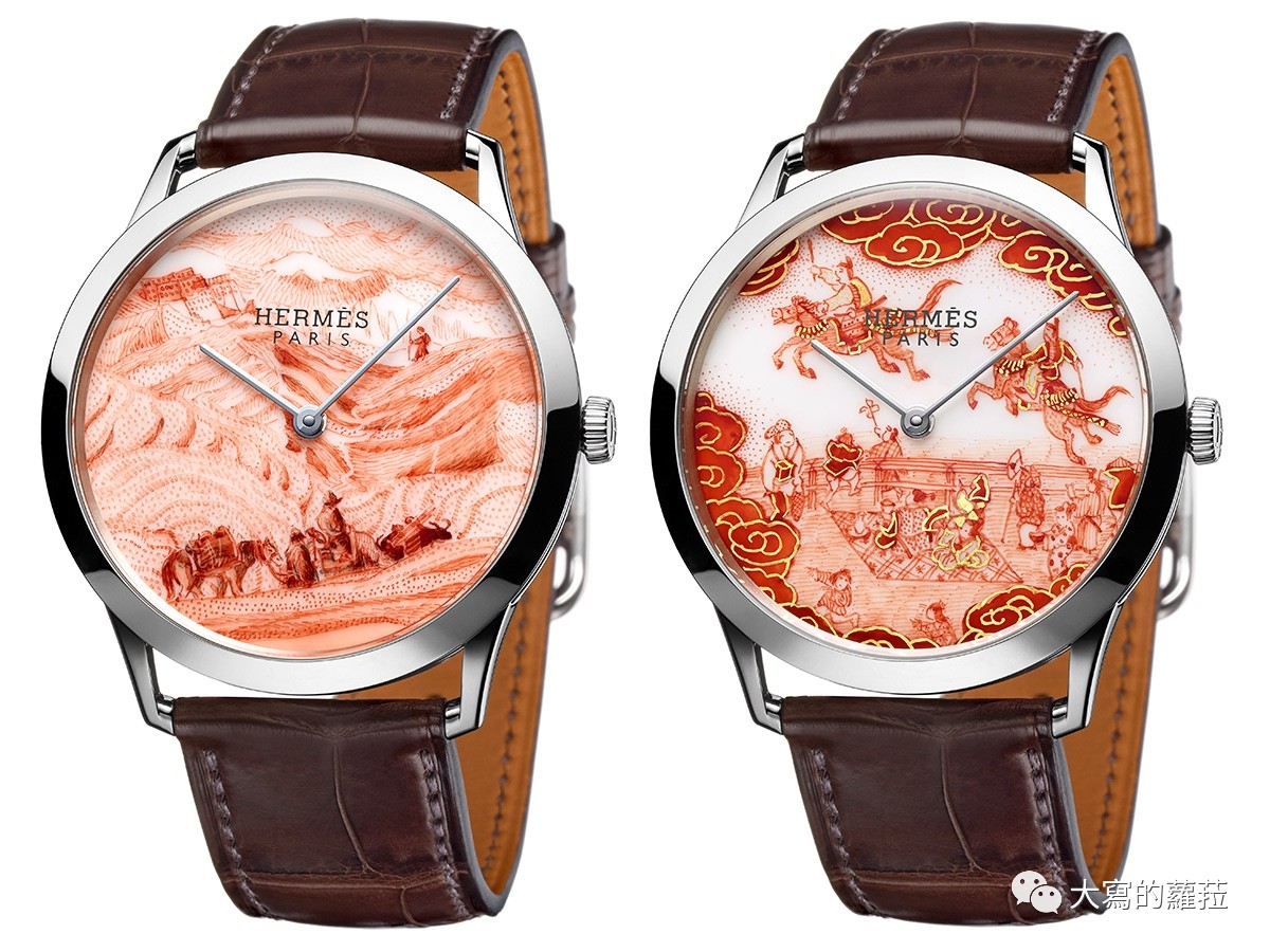 △爱马仕引入日本传统赤绘工艺的表款:Slim d’HermèsLa femme aux semelles de vent腕表(左)与Slim d‘Hermès Koma Kurabe腕表(右)。
