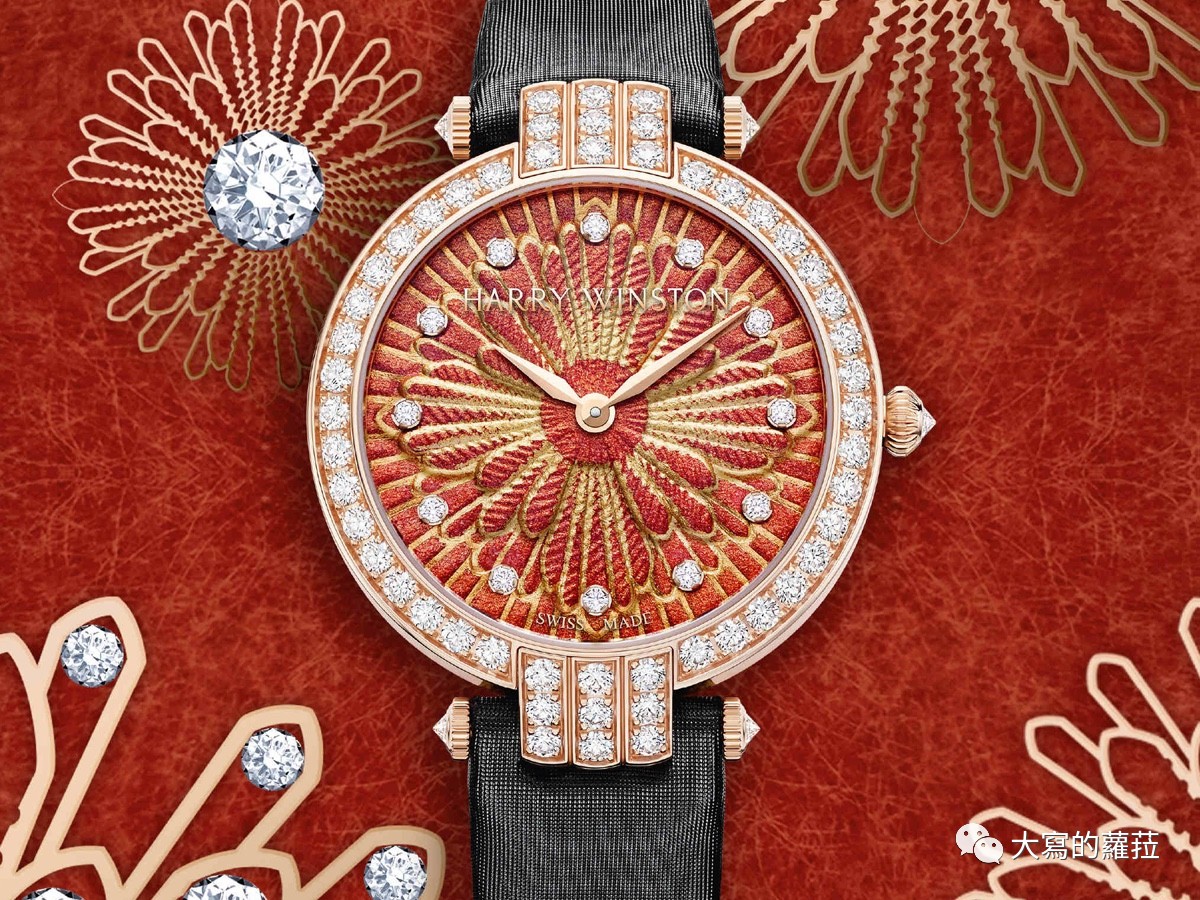 在中国传统的红色调里,赤色虽为最原始的开发颜色,但关于赤色的寓意却未如后来的红色调来得美妙与正面,在红色系里头,和赤色接近的色阶则为“朱”色。《王制孔疏》里头曾解释:“色浅曰赤,色深曰朱。”可见朱色是相对于赤色更鲜艳且更接近橘色的红。这样的朱色在Harry Winston Premier系列的Delicate Silk腕表创作中可以清晰地被看到:以丝绸为创作基础,进行特殊的浮雕工艺,再加以印压18K或22K金勾边,赤色的生丝被这样的特殊雕塑成像是绽放的复杂花瓣,在金色勾边与钻石的点缀中,就像是天空中绽放的一朵朱彩烟花。
