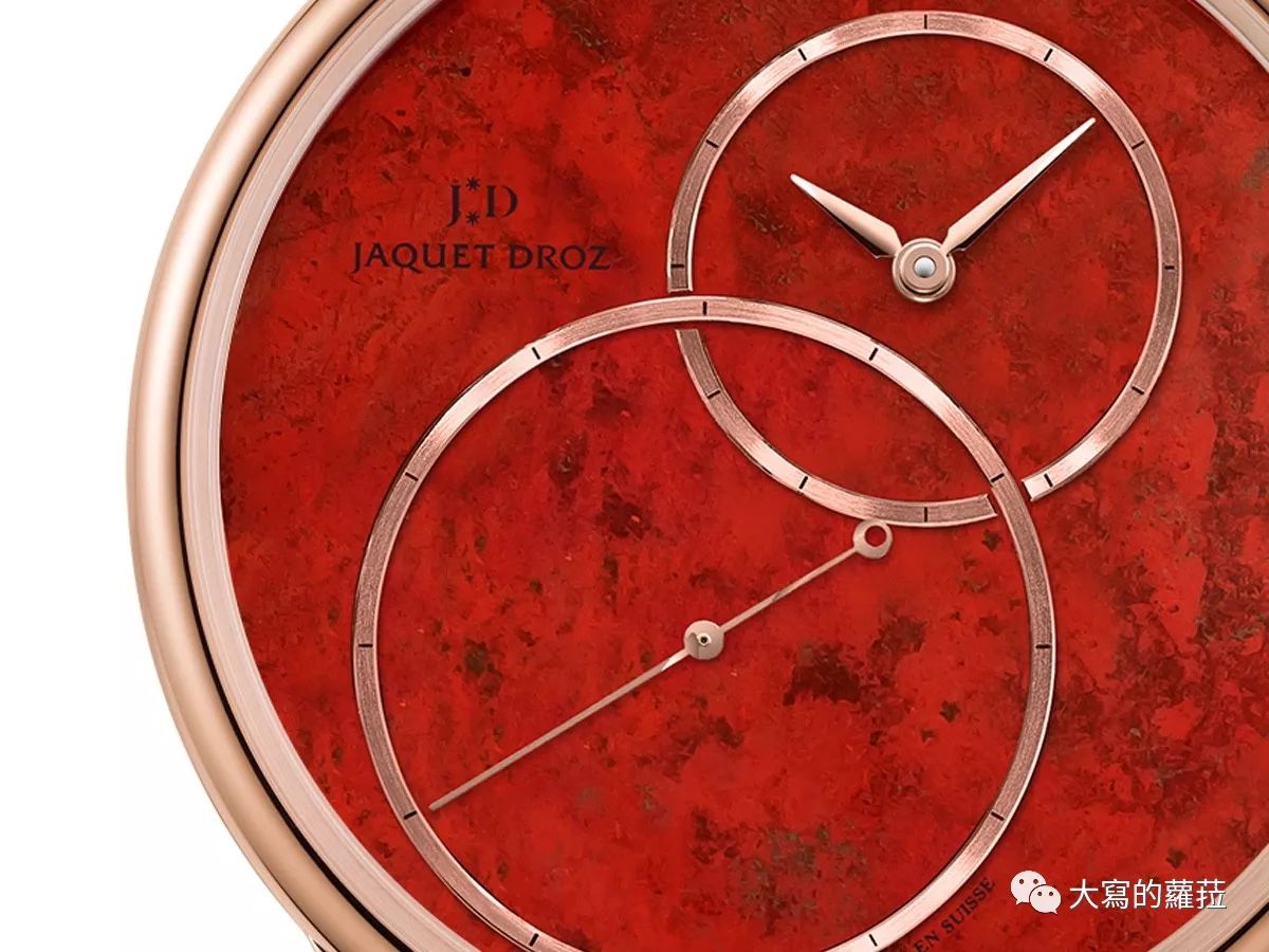 △雅克德罗这款以赤铜矿制成的表盘,成色更接近古代用以化妆的胭脂红。