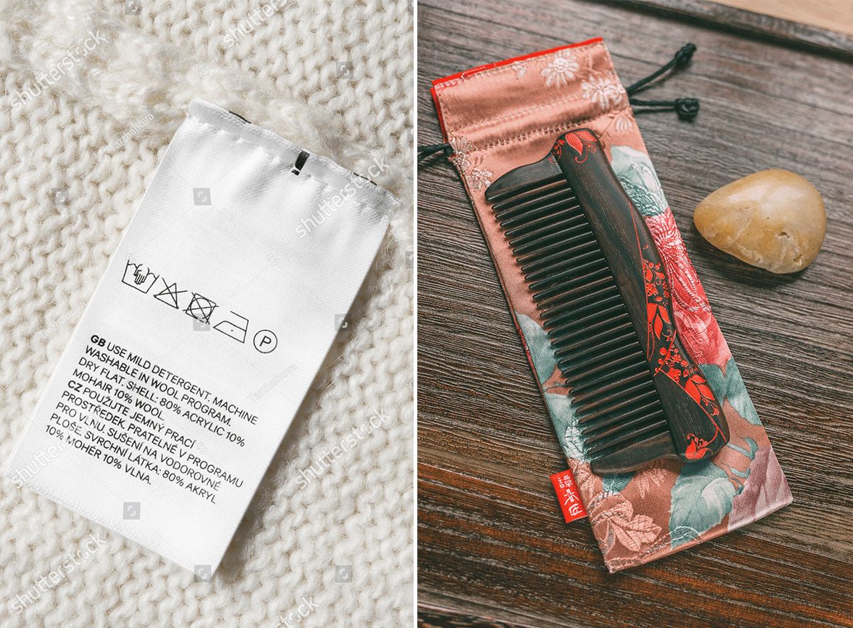 ▲左图:洗标上会有衣物护理说明和面料成分;右图:木梳来自谭木匠