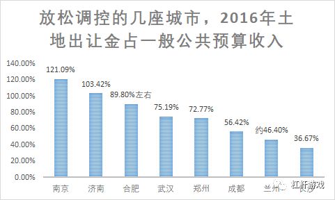通过杠杆游戏的上述数据计算,我们可以出,除了长沙、兰州外,这几座放松调控的城市2016年土地出让金占一般公共预算收入的比值,都在50%以上,甚至济南、南京超过100%。合肥略低,也接近90%。