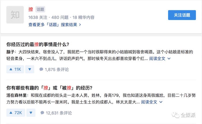 知乎上,“撩”的热度体现得更为直接。在话题“撩”下,有480个相关问题,包含“怎么撩?”、“撩与被撩的经历”,一切与爱情、甚至心情有关的话题都能被一个“撩”字概括,上万的评论和点赞汇集了话题热度。