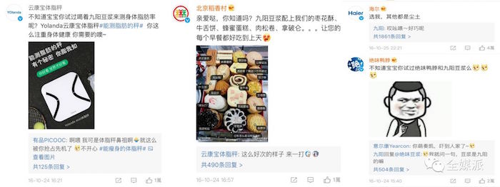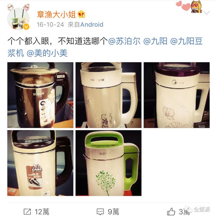 当一位普通的用户@章渔大小姐 正在苦恼要选哪一台豆浆机,一条“个个都入眼,不知道选哪个”的微博,竟然引来上百家官博施展撩消费者的能力。“亲爱的”、“宝宝”等称呼试图拉近与消费者的距离,同时将官博的严肃感降低,拉了一波品牌好感。