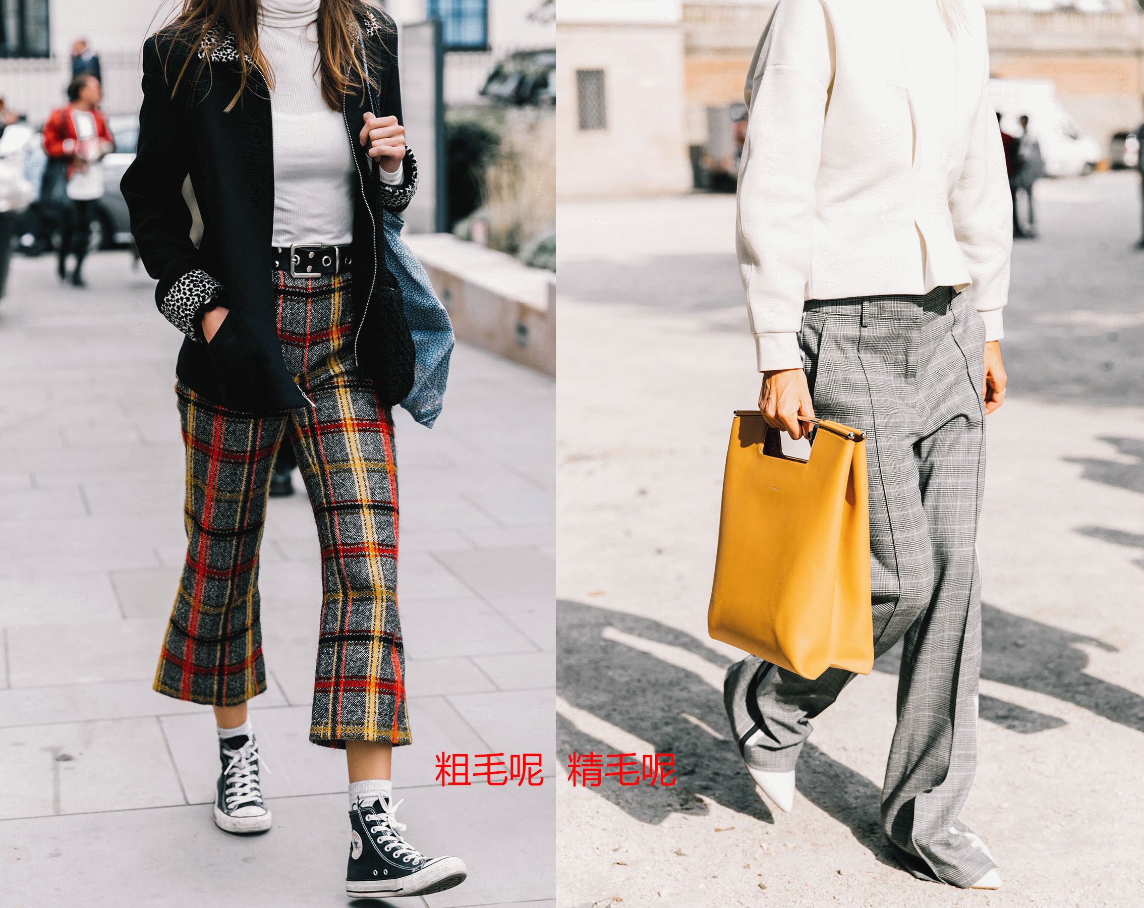有些粗纺毛呢把垂度做的比较好,上身也一样可以显瘦。反而一些精纺,把垂感做成“飘”或是“撑”的手感,那也是白搭。比如下图左边的裤子垂度就会比较好,而右边的裤子则手感偏飘。