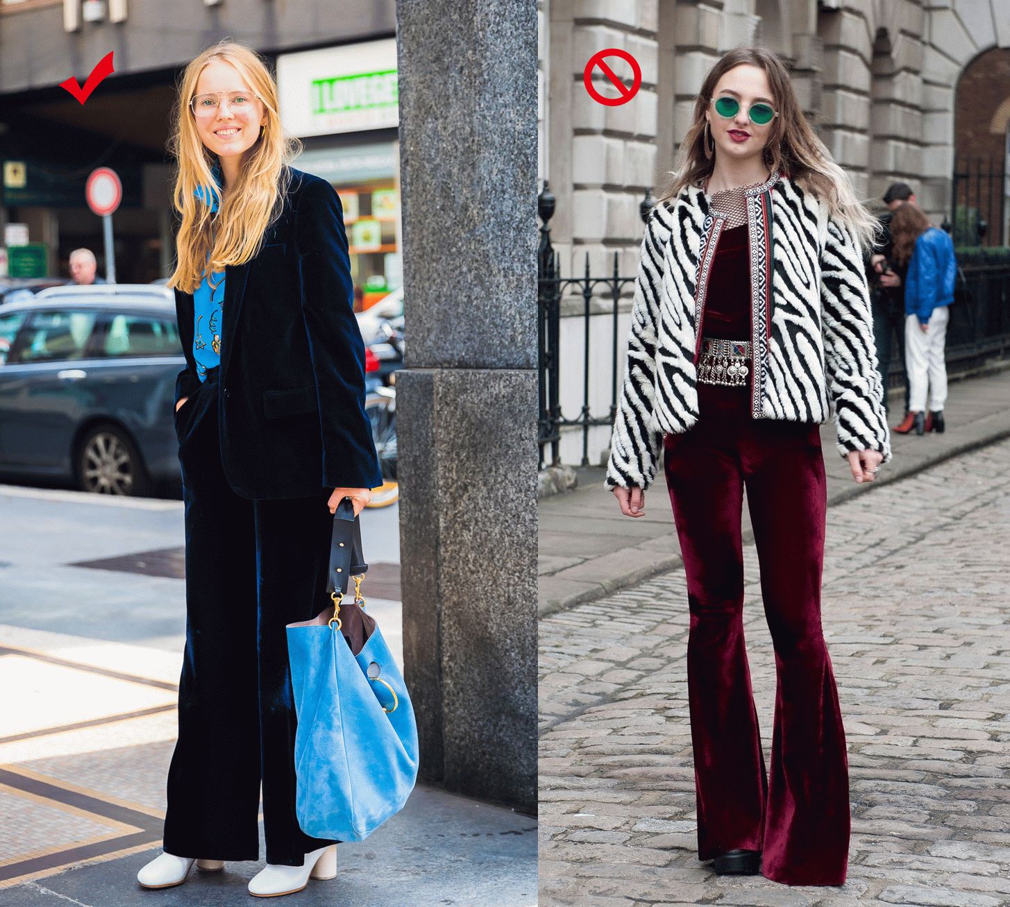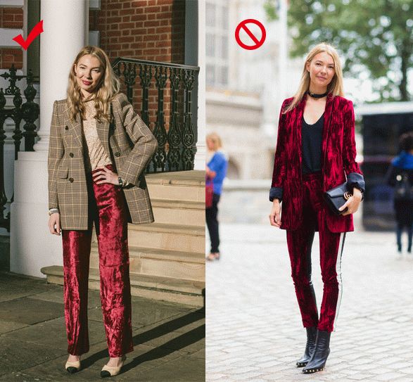 如果你是腿略粗,但也想尝试一下丝绒裤的话,那么一定要避免各种鲜艳的或浅色系的颜色。浅色和艳色的丝绒反光性太强了,一点腿部缺陷都会被放大。