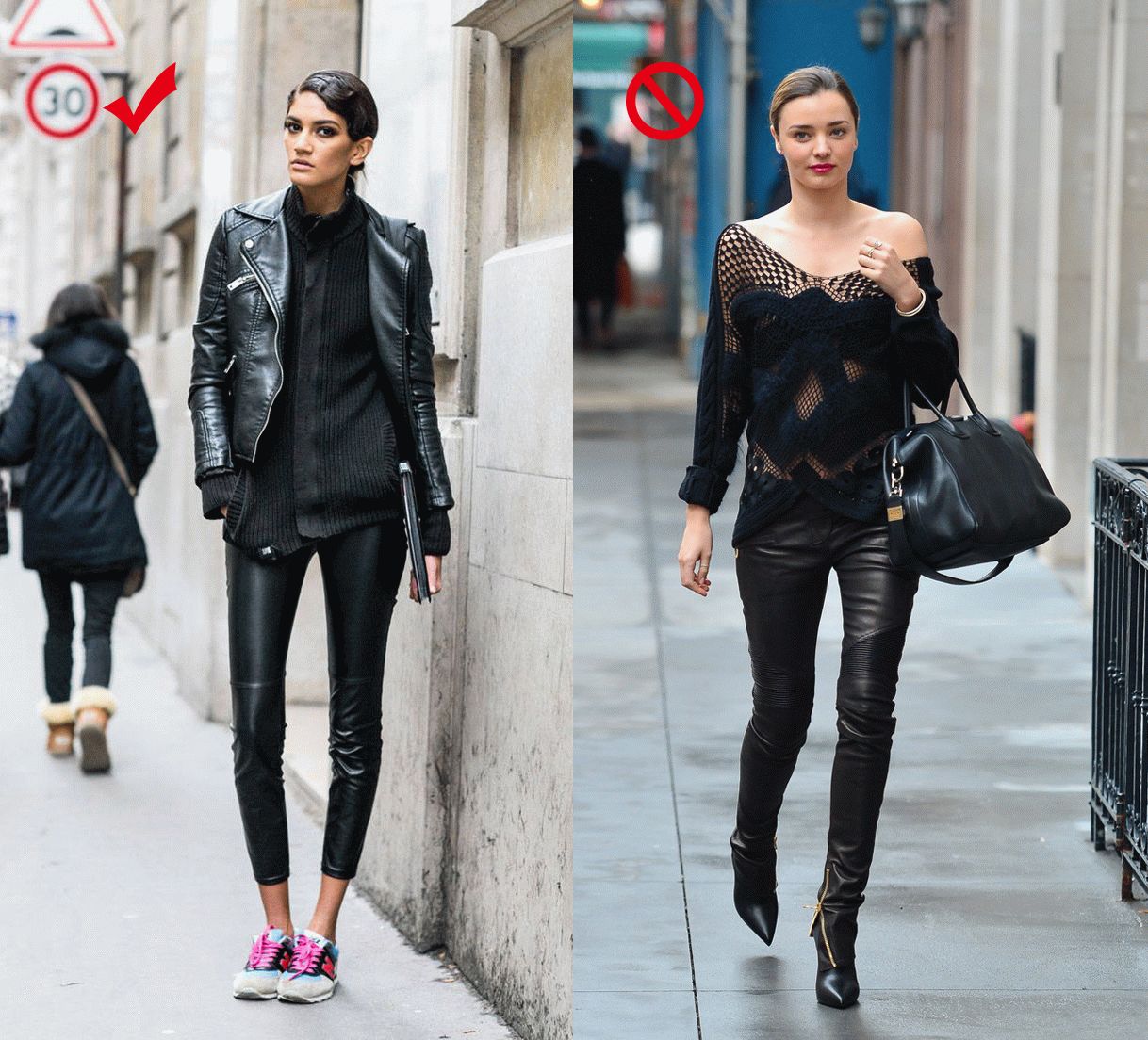 美如可儿尚且不能把透视毛衣+紧身皮裤的look驾驭超完美。我等大众老百姓脸,不如还是用帅气的中性风单品去跟皮裤做搭吧。