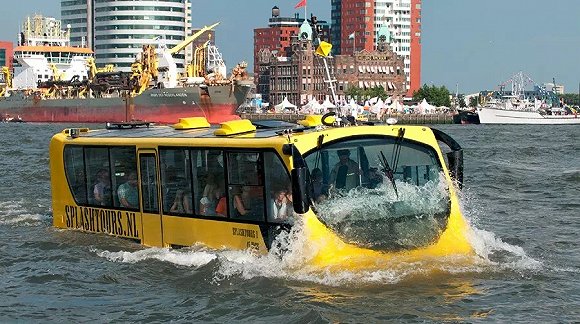 荷兰国土大都低于海平面,为了能让人们在公路和水路自由穿行,鹿特丹推出了一款水陆两栖公交车,吸引了大批游客,也成为了都市新景观。当地居民声称,暴雨来袭或海水暴涨时,此类公交车能够发挥更大的作用。