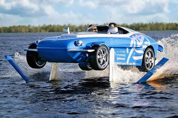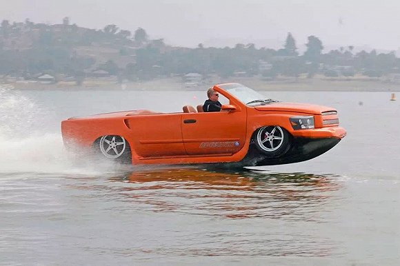 2010年,美国加州一家名为“WaterCar”的公司打造了一辆当时全球最快的海上汽车——Python两栖敞篷车,搭载了雪佛兰科尔维特跑车发动机,外观上船的影子不多,更像一阳刚的皮卡。水上最高速可达96.6 公里/ 小时,陆上最高速度可达201公里/小时,创造了2010年吉尼斯世界纪录。