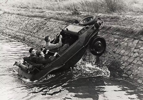 二战期间,德军装备的大众166型水陆两用车,陆地行驶最高速度接近90公里/小时,水中速度10公里/小时左右,受到很多德军官兵的广泛欢迎。到1944年末,沃尔夫斯堡工厂和保时捷位于斯图加特的工厂总计生产了14238辆。