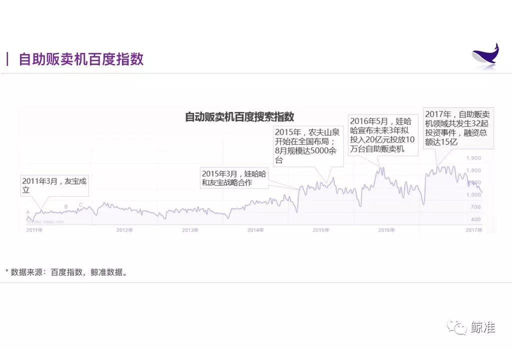 百度指数显示,2015年起自助贩卖机的搜索指数出现明显的上升趋势,2017年前三季度一直保持在高峰。鲸准用户数据显示,从1月份起,自助贩卖机的热度持续上升,在9月份达到高峰,此后一直保持在高位。