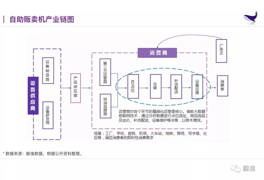 自助贩卖机产业链分为上游设备供应商和产品供应商,中游运营商,下游消费者和广告主。