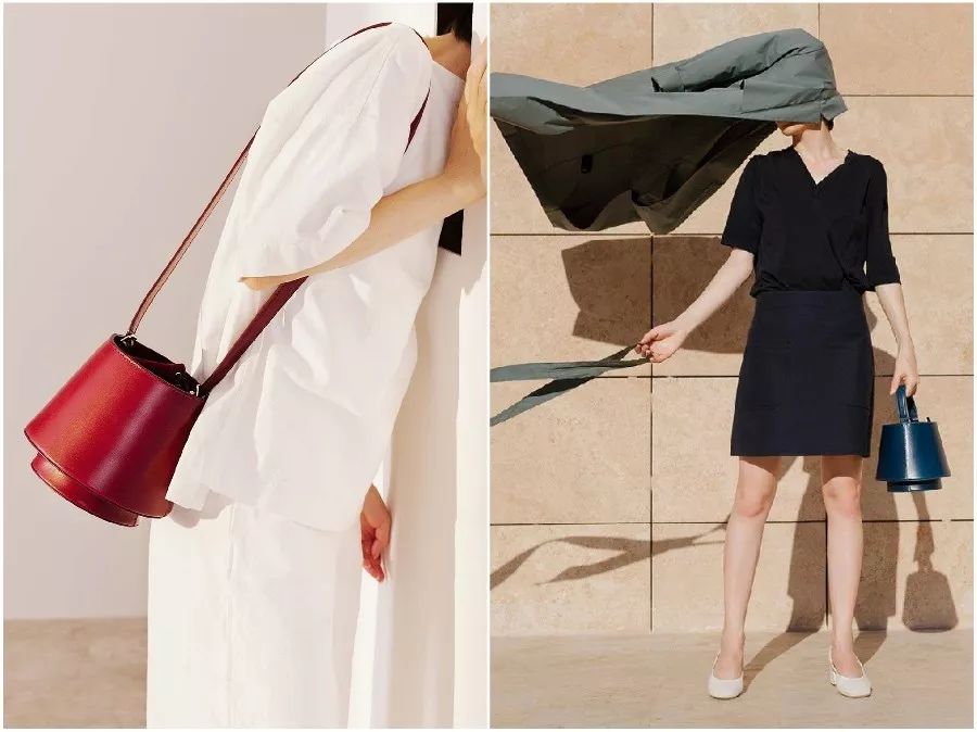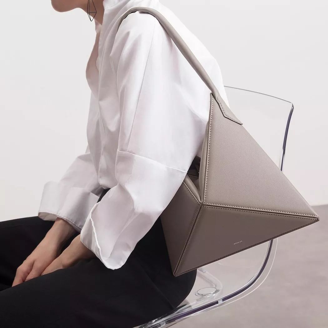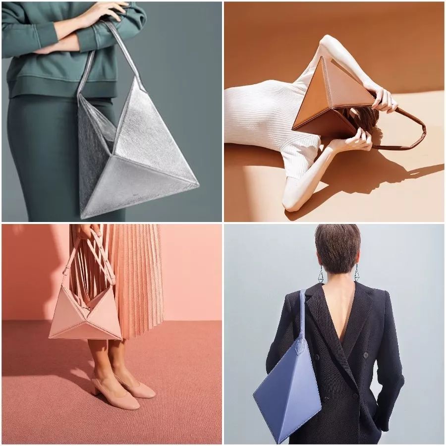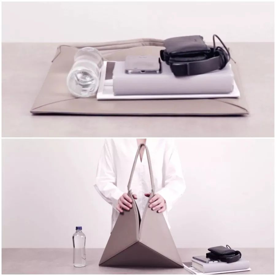 品牌主打款式,不装东西时可以摊平(就像三宅一生的主打款一样),装了东西就变成下边的几何立体造型。看似不大的包包可以装一本厚书、一瓶水、一本杂志、耳机、钱包和手机,真是小身材大容量~它还非常百搭,不仅能日常通勤用,周末玩耍休闲也可以 。