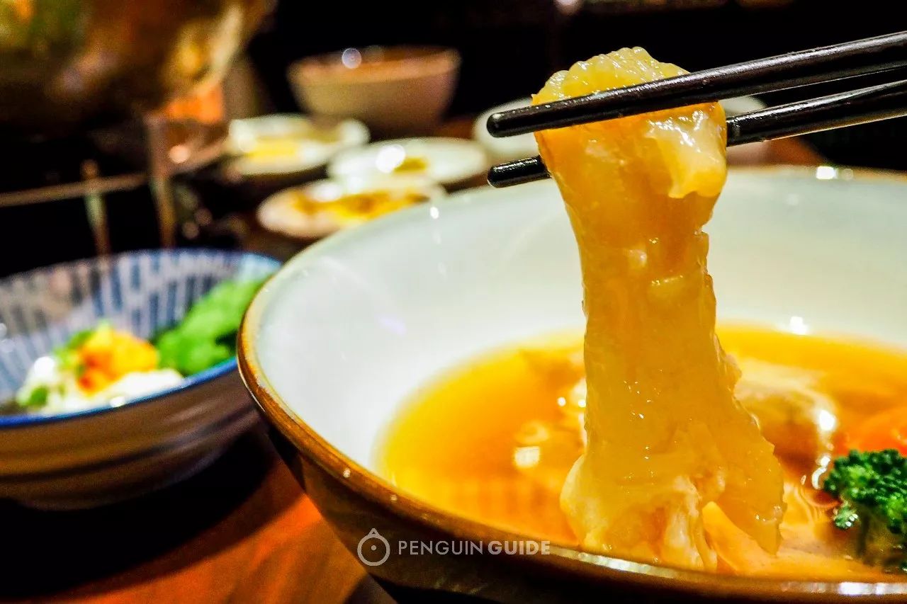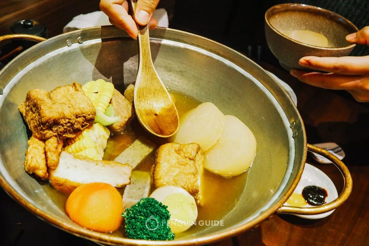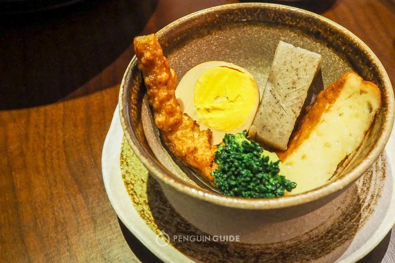 特别推荐自制炸牛蒡,牛蒡预煮晾干后,裹上自制的鱼浆和鱿鱼浆,先炸再煮。一口咬下去,柔韧鱼浆和脆落牛蒡交替登场,很是有趣。
