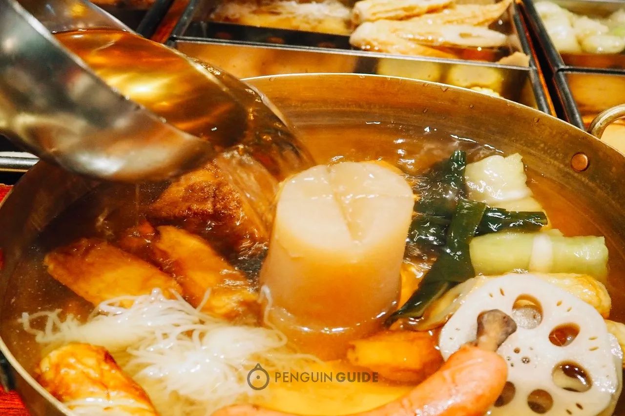 关东煮的出汁应该淡雅温和,不带侵略性,才能让每一样煮物都保留自身风味,而不是一味“浓香咸”。