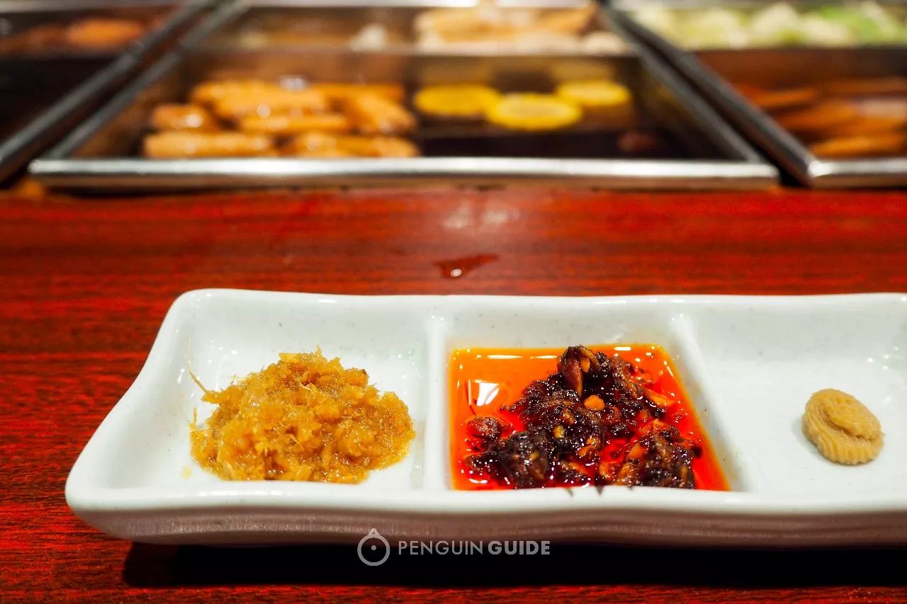 蘸料给了三种:黄芥末、柚子胡椒和田乐味噌,柚子胡椒是亮点,清新中带着辛辣,但吃到最后发现三种打混了一起蘸,也很不错。