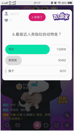 当天花椒《百万赢家》共为该场活动准备了近千道题目,内容涵盖天文地理、人文历史、体育科技、娱乐影视及热门话题等等。而且这些题目多是多个领域的混合搭配,不仅难度系数较大,还经常出其不意。当天参加的人数为77万多人,第八题“最接近人类指纹的动物是?“就淘汰掉了五多万人,主持人马丁则带领网友起哄,吐槽题目“太坑”。
